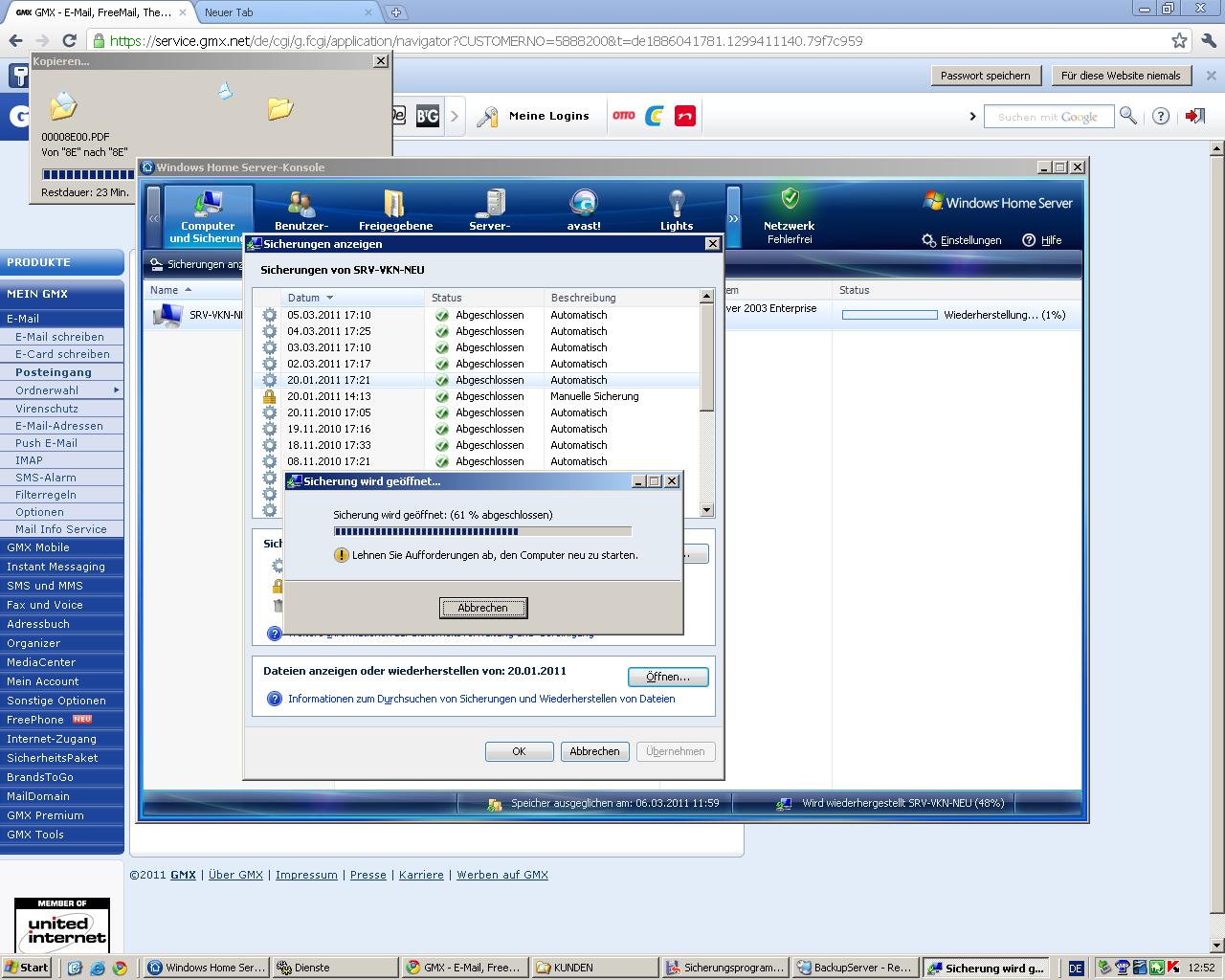 ich habe das Problem, einen Daten Sicherung vom WHS (Acer H340 aktuellste Updates installiert) auf einen w2k3 Server wiederherzustellen. Bei Wiederherstellung bricht die Wiederherstellung bei 79% ab und zwar mit Fehlermeldung: Es kann keine Verbindung mit dem Sicherungsdienst des Servers hergestellt werden. Prüfen Sie, ob alle Dienste ausgeführt werden. Beschreibung durch MS KB http://support.microsoft.com/kb/939218/de durchgearbeitet. Keine Lösung. Mit anderem Benutzer / veränderten Passwörtern = keine Lösung. Dienste Manuell gestartet auf beiden System = Keine Lösung. Andere Sicherungsdateien verwendet = Keine Lösung.