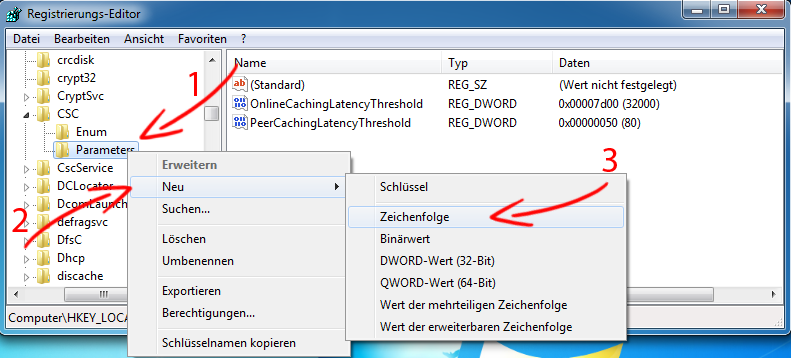 HKEY_LOCAL_MACHINE\SYSTEM\CurrentControlSet\Services\Csc\Parametersdiesem den Namen