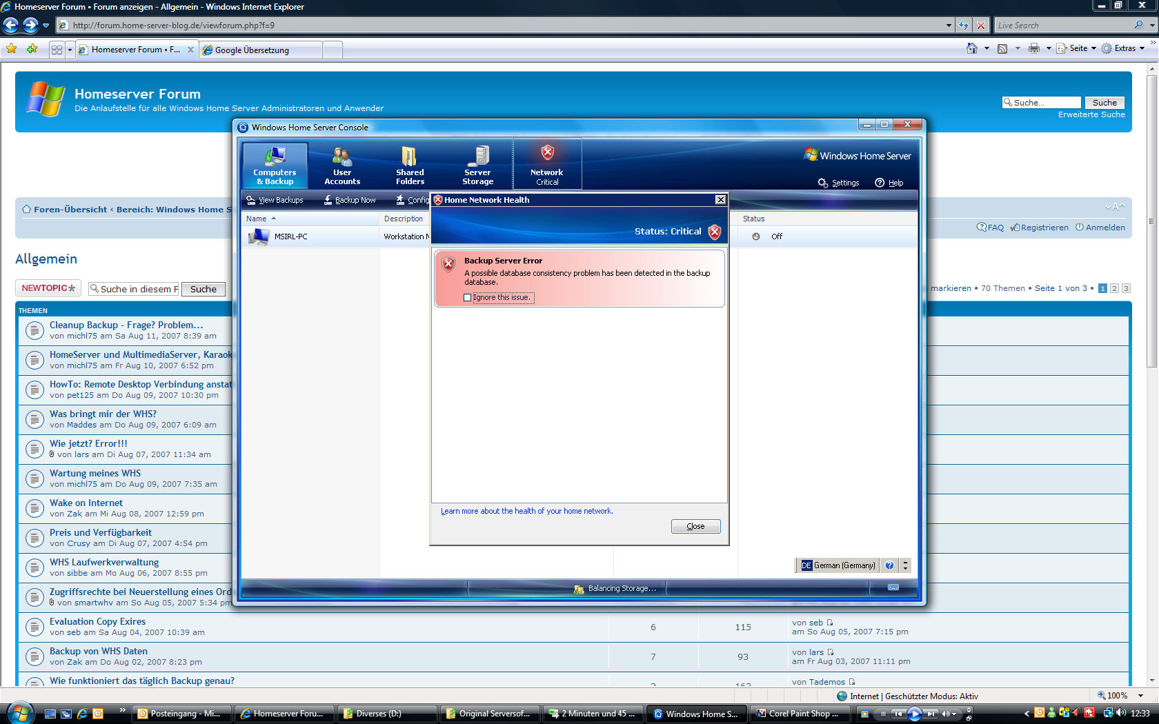 hatte folgende Fehlermeldung, nachdem ich zwei Clients auf dem WHS gelöscht hatte (Computers & Backup)