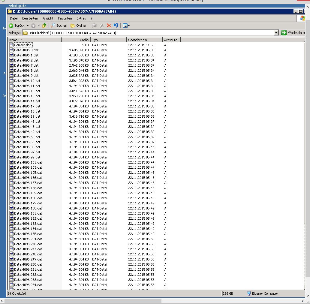 richtig ... s. obenDie Datein tragen das heutige Datum, die meisten ca 5 Uhr morgens, Extension .dat, die meisten 4.194.304 KB groß, Namen z.B. Data.4096.257.dat (ich hatte das früher schon beschrieben). Sind das Sicherungen der clients