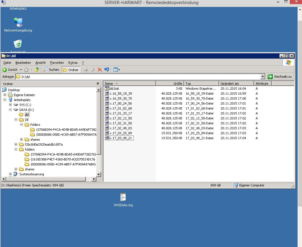Auf diese Lösung komme ich ggf. zurück für den Rest der Dateien - soweit noch nicht durch das Batch verdrängt.Nobby1805 hat geschrieben:das wäre natürlich die schnellste Lösung gewesen .. s. oben ... das geht am schnellsten indem du alle Dateien auf D:\folders\{...8086...} löscht (Achtung: hier der Pfad ohne DE) und dann den WHS bootest