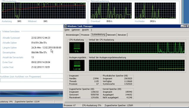 Ich habe, wenn ich in ASoft AdminiMe nachsehe, eine extrem hohe CPU-Last (und keine Angaben mehr zu Durchsatz und Temperatur). Wie dem Screenshot zu entnehmen ist, werden aber über den Taskmanager (bin per RDP auf dem WHS) andere Werte ermittelt, es ist auch kein Prozess in dieser Größenordnung aktiv. Dies ist reproduzierbar (drauf gekommen bin ich durch den subjektiven Eindruck, daß der WHS seit ein paar Tagen ziemlich laut ist.)
