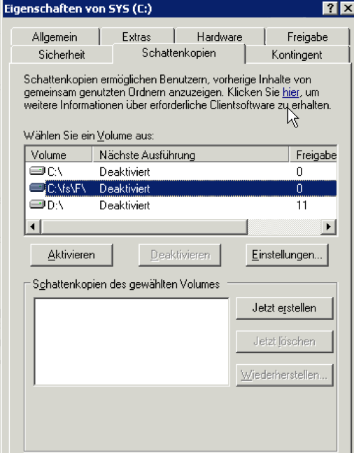 Die zuletzt geposteten Fehlermeldungen weisen aber definitiv auf den WHS ... poste bitte einen Screenshot der Schattenkopien Registerkarte ... die Fehlermeldung dürfte nicht kommen wenn wirklich alles deaktiviert ist