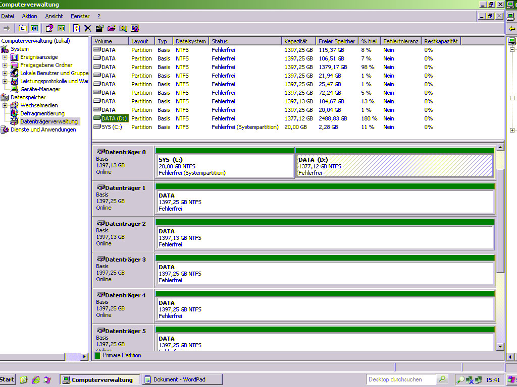unter C:\fs\ werden alle 8 Daten-FP aufgeführt. C: (System) und Partition D: (Daten) sowie die RAID-FP erscheinen dort nicht.Nobby1805 hat geschrieben: Falls du nicht die SYS-Partition vergrössert hast, was von MS nicht unterstützt wird, dann solltest du bitte auf alle C:\fs\?? prüfen, ob dort außer den Verzeichnissen DE und System Volume Information und der Datei QSM_VolumeID noch etwas anderes liegt ... und dann im Verzeichnis DE sollte es nur DEguid.txt und die Verzeichnisse Shares und Folder geben