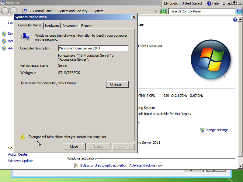 Mit einem Klick auf "Close" schließen wir nun die Systemeigenschaften und erhalten gleich die nächste Aufforderung den Rechner neu zu starten.