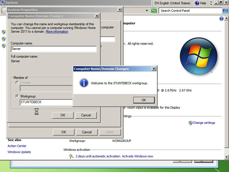 Mit einem Klick auf "Change" bzw. "Ändern", können wir nun die Arbeitsgruppe umbenennen und bestätigen die Änderungen mit einem Klick auf "OK".