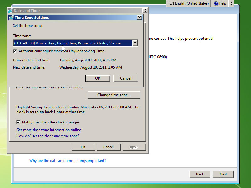 Nach einem Klick auf "Next" kommen wir zu den Einstellungen bezüglich der Zeitzone und Uhrzeit.