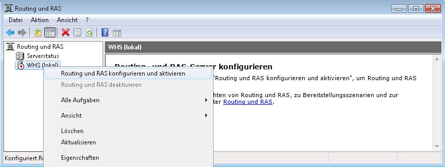 3.) Rechte Maustaste auf WHS (lokal) -> Routing und RAS konfigurieren und aktivieren.