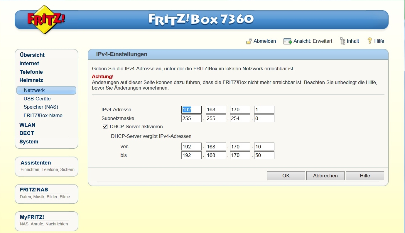 Danach änderst du das Subnetz und den IP Bereich deiner Fritzbox!