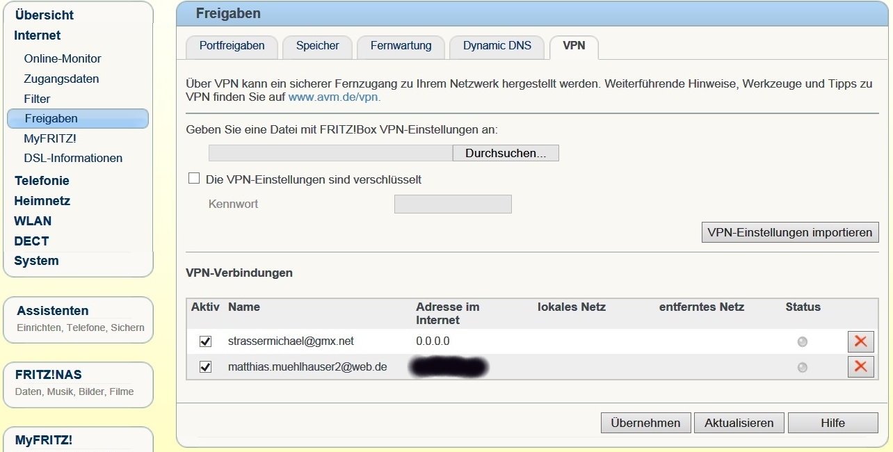 @ Joachim, obschon es eigentlich reichen würde nur den WHS zu erreichen mag es im einen oder andern Fall doch praktisch sein von unterwegs zu Hause auch andere Geräte direkt zu erreichen. Ich strebe eher eine Client to Lan Verbindung an als eine Client to Client verbindung. Die beiden AVM Client Softwares heissen Fernzugang einrichten und Fernzugang. Mit der SW Fernzugang einrichten erstellt man jene cfg Datei die man in die FritzBox importiert und Fernzugang richtet man auf den entfernten Clients ein. In die SW Fernzugang muss man die zuvor mit erstellte cfg Datei für den entfernten Rechner importieren.