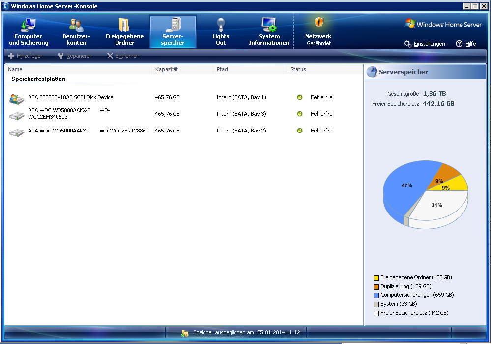 Clients: 2* HTPC, Win7 HP 32 Bit - 2*Arbeitsrechner Win7 HP 64 Bit - 1*Laptop Win7 HP 32-Bit