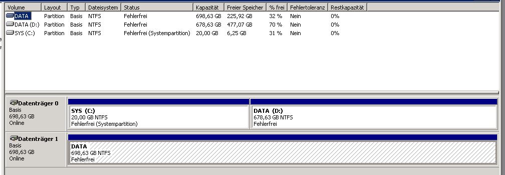 Heute Morgen gab es die selbe Fehlermeldung (Datei wird verwendet) und die Hardisk wird immer noch als fehlend aufgeführt. Der Server verhält sich sonst normal, alle Shares sind da bis auf die Ermittlung des Speicherplatzes die ohne Ende läuft.