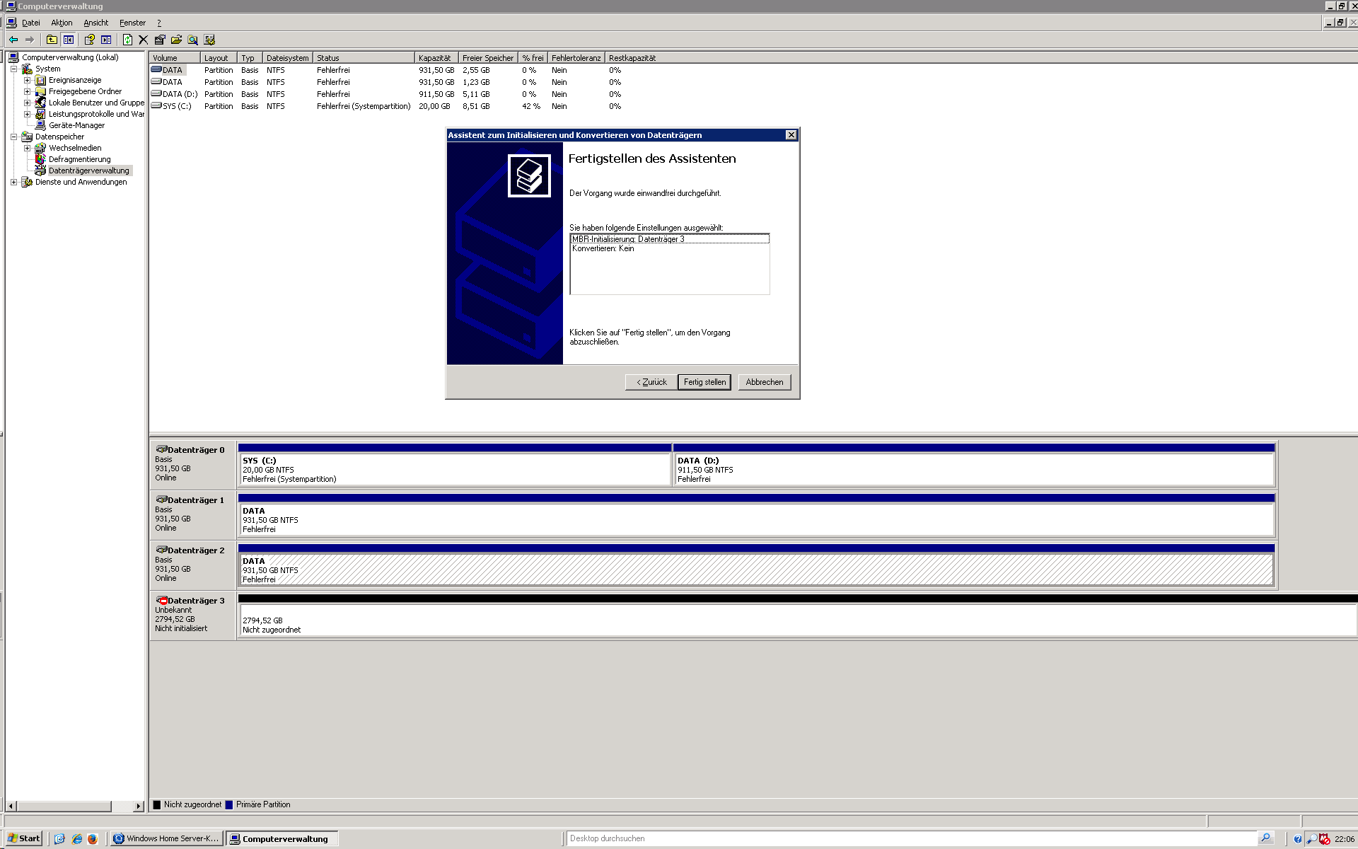 Screen 4: Ich möchte die Platte zum Serverspeicher hinzufügen. Ich hatte vor, diese hinzuzufügen und dann eine andere auszuklinken um dann den WHS die Daten auf die neue Platte verteilen zu lassen, die auf der alten drauf waren. Dann wollte ich sie aus dem Server nehmen und die nächste Platte einsetzen. Am liebsten würde ich dann auch noch die Platte mit dem System austauschen gegen eine 3TB, aber das wäre dann der letzte Schritt gewesen.