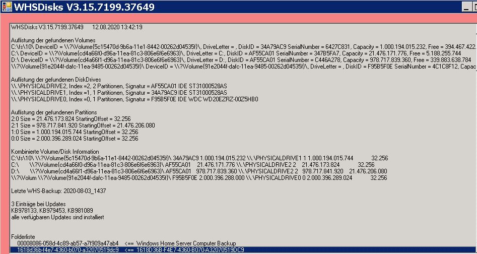 @12.08. leider startet deine WHSDisks mit einer Fehlermeldung und produziert keine Logdatei mehr. deswegen als Bilder...